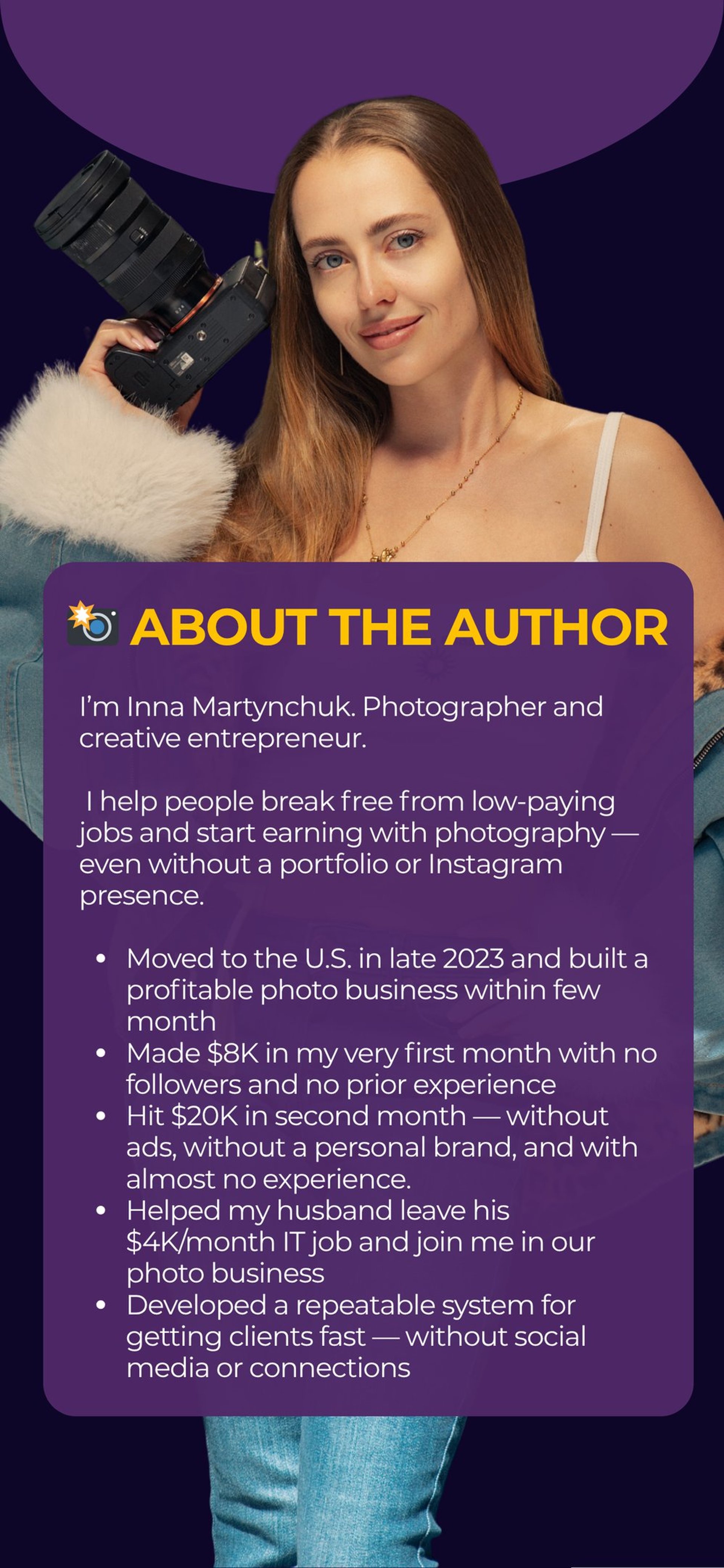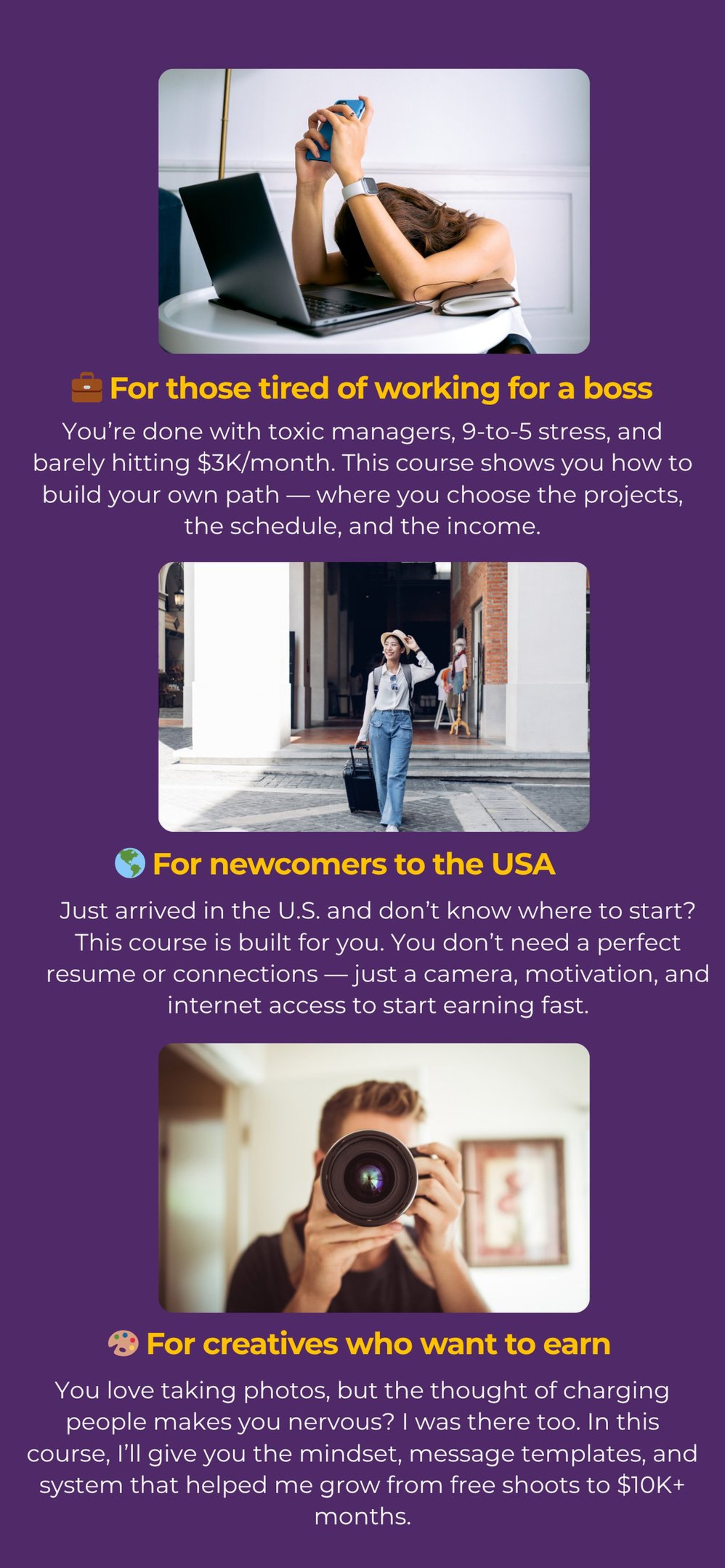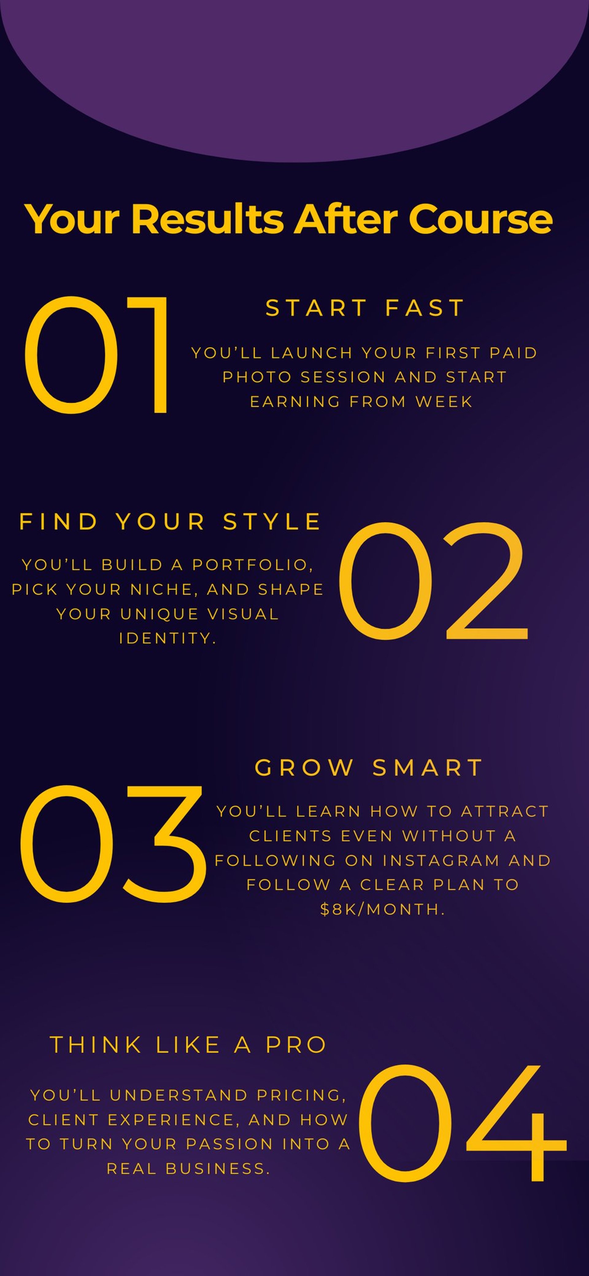 If you complete the lessons and feel the system isn’t right for you, simply send a short email within 14 days of purchase, and you’ll get a 100% refund — no questions asked. Our goal is to help you start earning with photography, not to sell you something that doesn’t deliver. Only 1–2% of students ever request a refund because the course is designed to get real, beginner-friendly results.