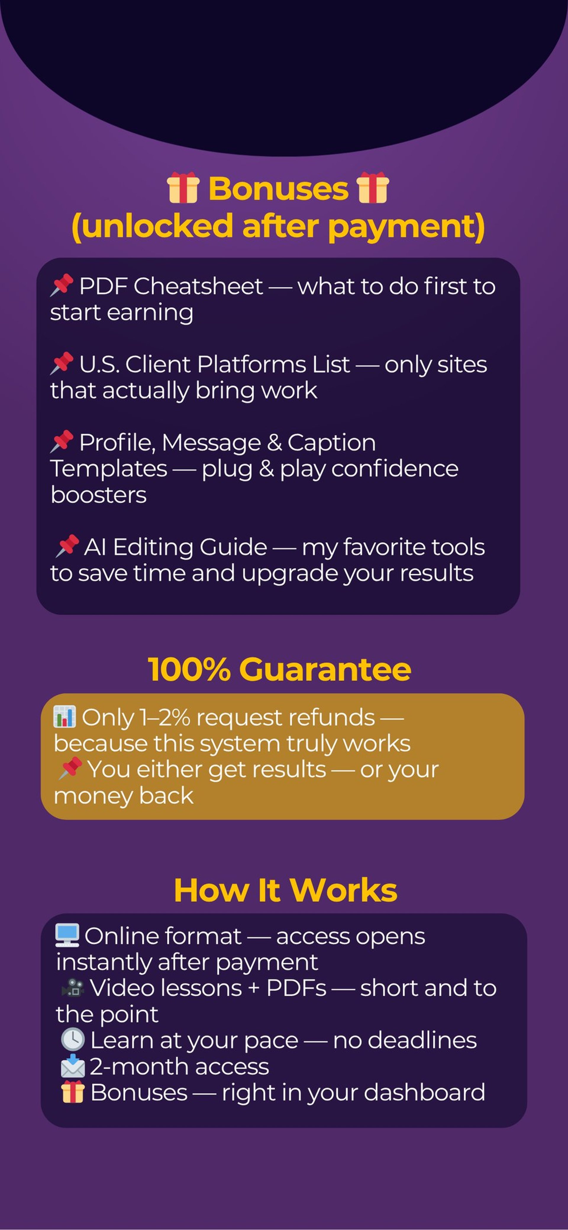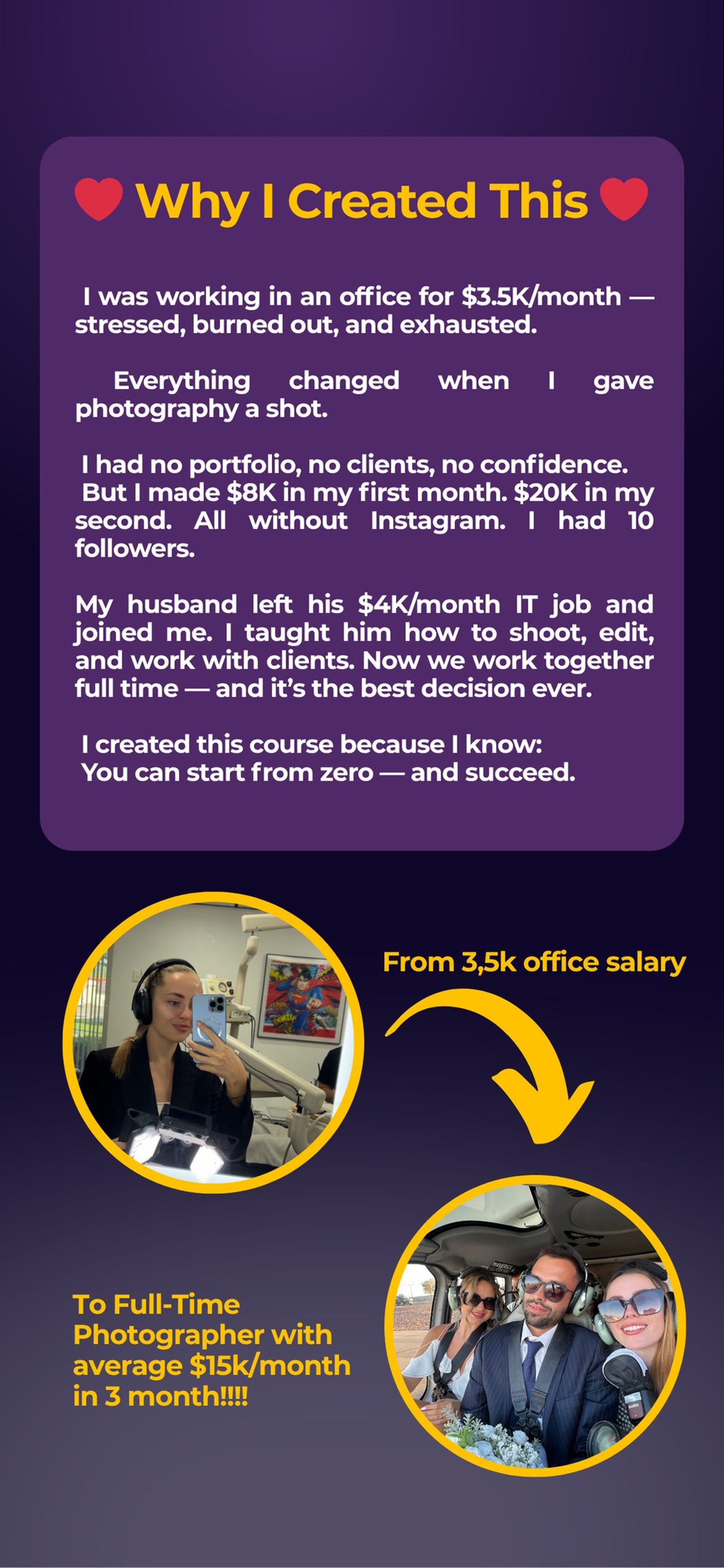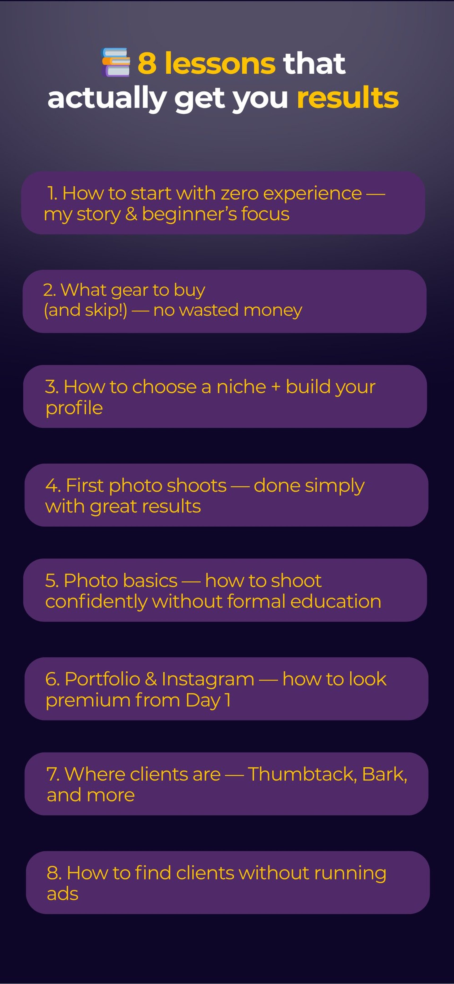 If you complete the lessons and feel the system isn’t right for you, simply send a short email within 14 days of purchase, and you’ll get a 100% refund — no questions asked. Our goal is to help you start earning with photography, not to sell you something that doesn’t deliver. Only 1–2% of students ever request a refund because the course is designed to get real, beginner-friendly results.